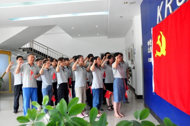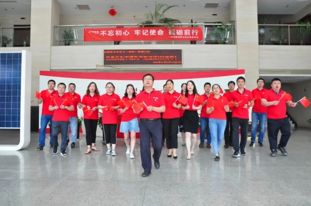 聽(tīng)到熟悉的樂(lè)曲響起,阿特斯光伏電力(洛陽(yáng))有限公司的黨員們從各個(gè)辦公室走出,隨著節(jié)拍舞動(dòng)手中的小國(guó)旗,帶著滿腔的熱忱、昂揚(yáng)的斗志,高聲唱起“他指給了人民解放的道路,他引導(dǎo)中國(guó)走向光明......”